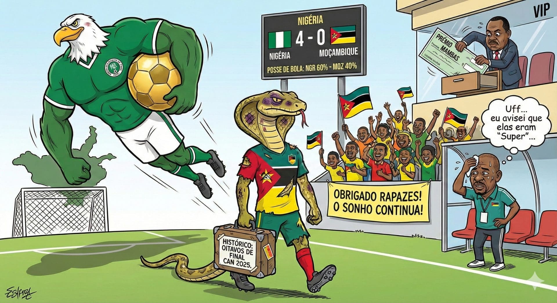 Moçambique acordou hoje do sonho dourado. A caminhada histórica da Selecção Nacional no Campeonato Africano das Nações (CAN) 2025 chegou ao fim nos Oitavos de Final, após uma derrota frente à poderosa selecção da Nigéria por 4-0.